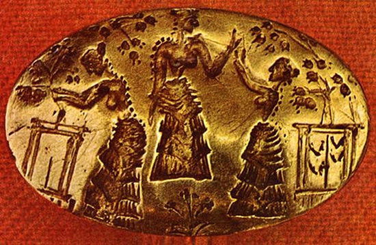 A golden Late Minoan ring presents a pair of “planter shrines” with fruitful trees, likely pomegranates---one tree being resolutely grasped, perhaps planted or shaken or even torn up, and the other tree equally fruitful but untouched. Its attendant turns with lifted arms and palms toward the central woman or possible deity (the lack of distinction is typically Minoan): she rises from a triple-flowering plant (possibly crinum lily, blooming in winter, spring and summer, often a flower of graveyards), and lifts a blessing palm in return. On one side, the sowing and reaping of food and medicines, time bringing death, loss and change: on the other side, the living tree enduring, and its human expression a gesture of renewal, praise, celebration and gratitude. Marking out that shrine of life-eternal (as on the Agia Triada larnax), a doubled pair of ancestral (and Great Year cycle?) “horns.”